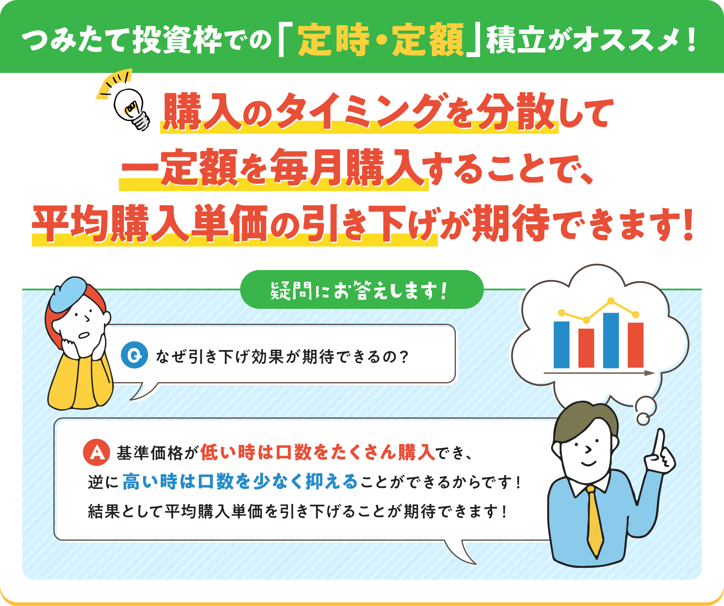 購入時に一度に全額 投資せず、数回に分けたり毎月一定額の投資にすることで、購入時期を分散させブレを小さくすることが期待できます。積立では決まったタ イミングで自動買付けができるので手間もかからずおすすめです。