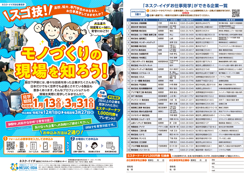 飯田下伊那には様々な技術をもった企業がたくさんありプロフェッショナルの現場を実際に見学ができます!